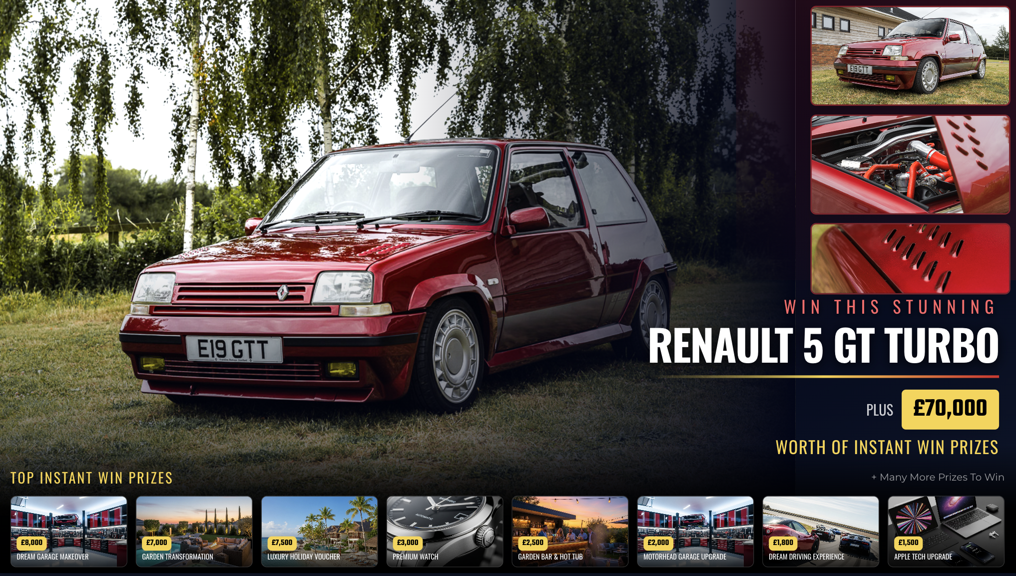 Contact Us InstagramThis field is for validation purposes and should be left unchanged.Name(Required) First Telephone(Required)Email(Required) Enquiry(Required)CAPTCHA contact@silverstonedreamcars.co.uk Unit 10, The Tanyard, Leigh Road, Street, Somerset, BA16 0HD £2.99 Original price was: £2.99.£1.99Current price is: £1.99.WIN THIS RENAULT 5 GT TURBO! PLUS OVER £70,000 OF INSTANT WIN PRIZES! 25% OFF NOW!