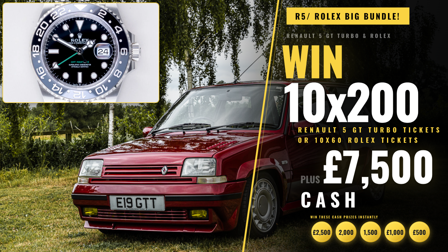 π RENAULT 5 GT TURBO / ROLEX FINAL 3 BUNDLE!! β WIN Β£7,500 CASH & HUGE 10×200 RENAULT GTT TICKETS OR YOU CAN NOW CHOOSE TO HAVE 10x 60 ROLEX ‘BRUCE WAYNE’ TICKETS INSTEAD!