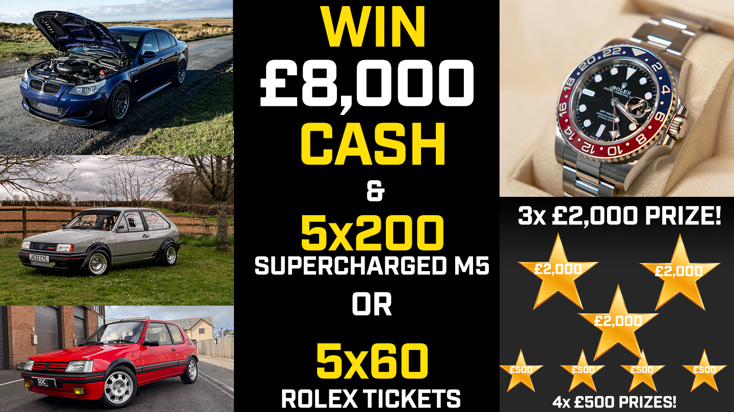 CHOOSE YOUR COMP! WIN £8,000 CASH INCLUDING 3x £2,000 GOLDEN TICKETS & 4x £500 TICKETS! PLUS EITHER 5×200 TICKETS IN TO OUR £230,000 SUPERCHARGED V10 M5 MULTI-CAR COMPETITION OR 5×60 TICKETS FOR OUR NEWLY LAUNCHED ROLEX PEPSI COMPETITION!